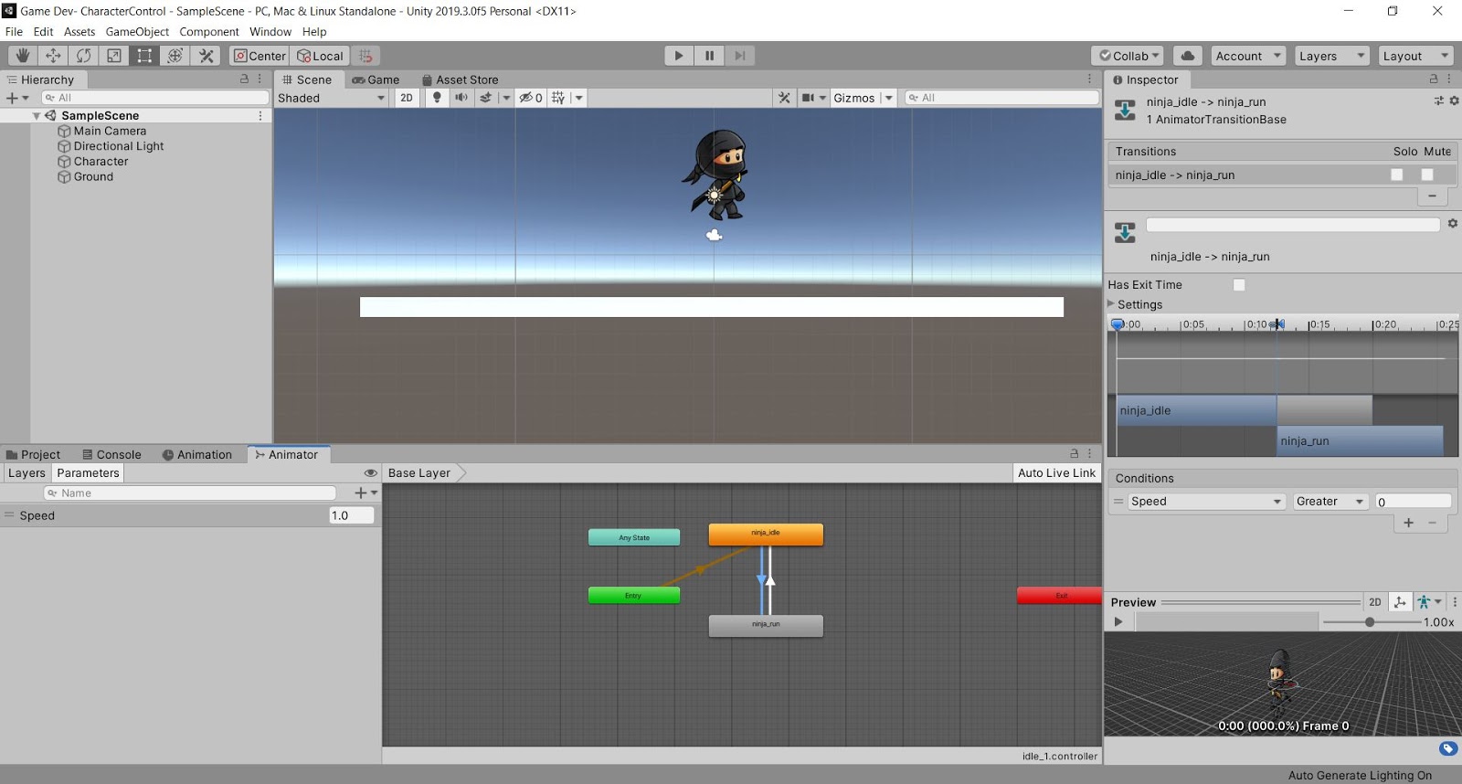8. Do the same with ninja_run transition line but change the transition duration "0.1" and condition (Speed) to "Less" "0.1"